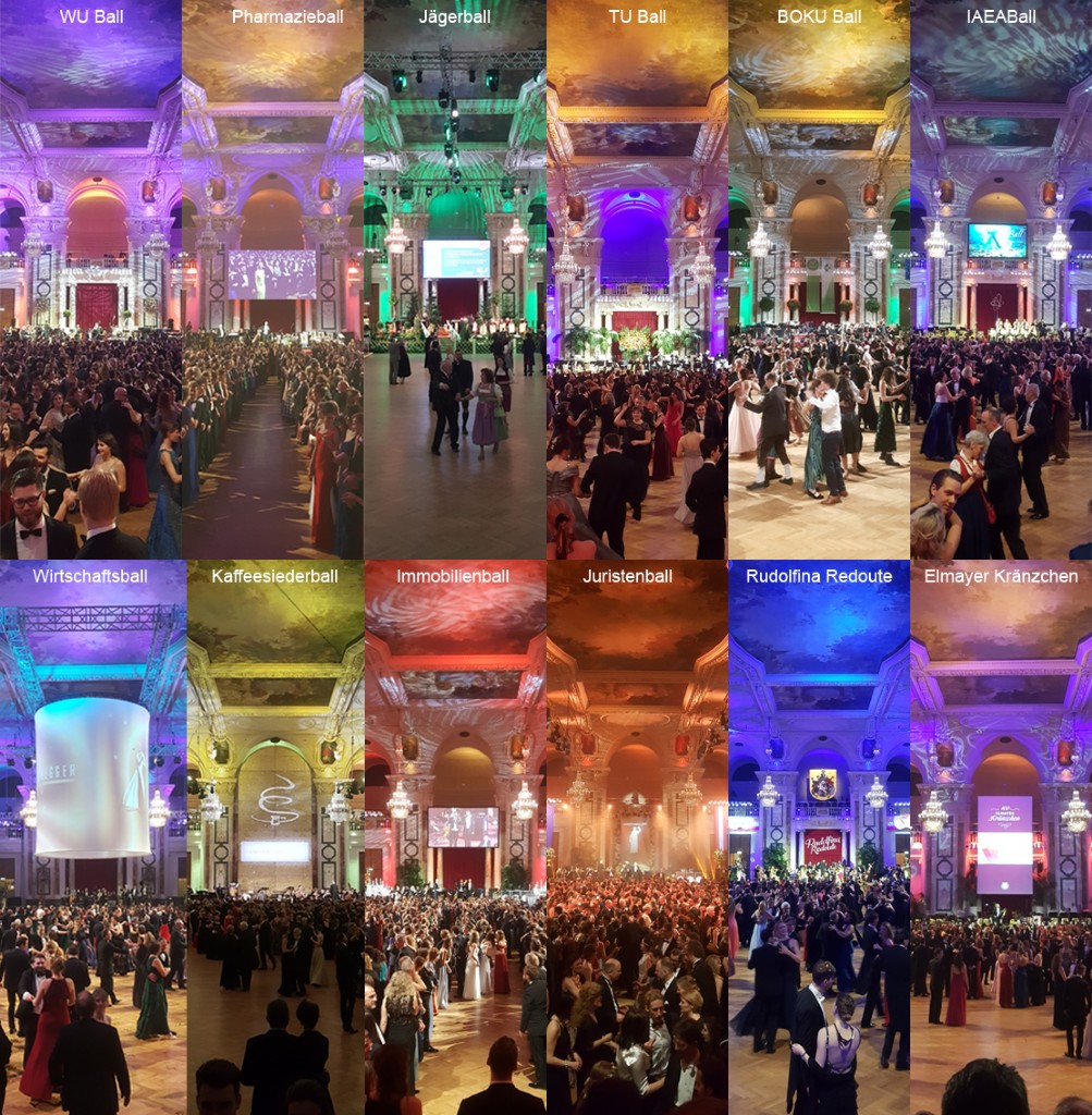 Silvesterball, Steirerball, WU Ball, Zuckerbäckerball, Ball der Pharmacie, Akademikerball, Ärzteball, Jägerball, TU Ball, BOKU Ball, IAEA Staff Ball, Ball der Wiener Wirtschaft, Juristenball, Rudolfina Redoute, Elmayer Kränzchen